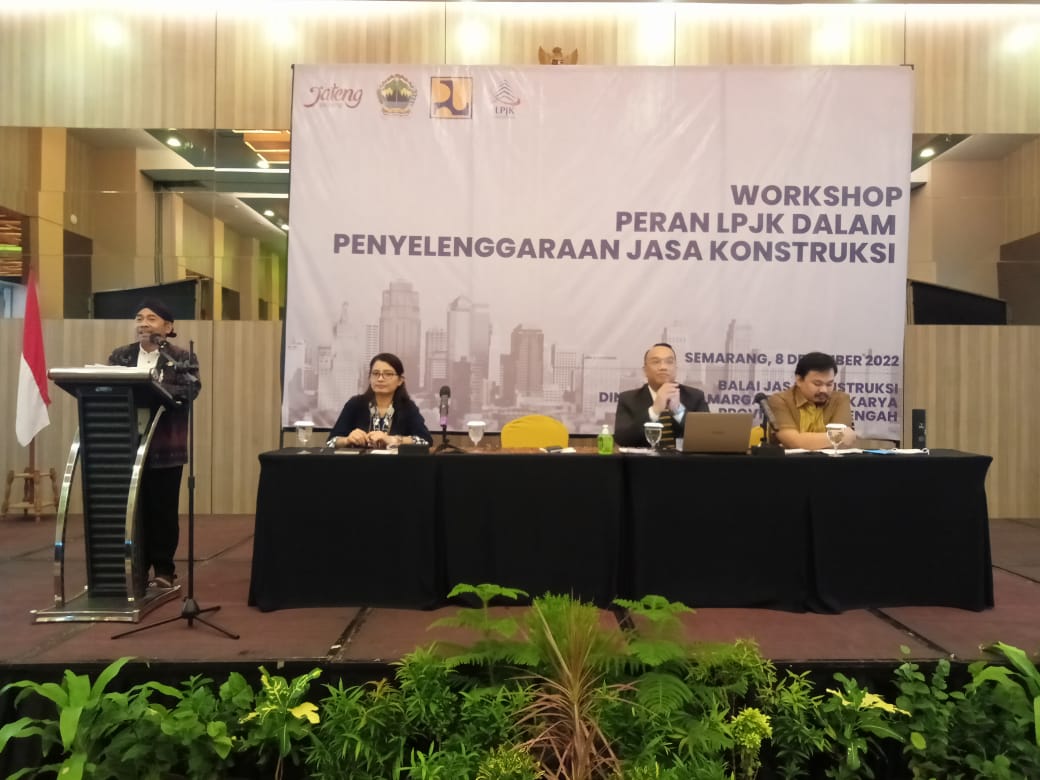 Dalam rangka pelaksanaan tugas Pemerintah Daerah yaitu pembinaan kepada masyarakat jasa konstruksi serta meningkatkan kapasitas dan kompetensi para pelaku jasa konstruksi, maka pada hari Kamis, 08 Desember 2022 Dinas PU Bina Marga dan Cipta Karya Provinsi Jawa Tengah menyelenggarakan Workshop Peran LPJK Dalam Penyelenggaraan Jasa Konstruksi. Kegiatan ini dilaksanakan secara luring di Semarang dan dihadiri oleh instansi pemerintah provinsi, instansi pemerintah Kab/Kota, anggota asosiasi profesi dan anggota asosiasi badan usaha di wilayah Provinsi Jawa Tengah. Kegiatan dibuka oleh Kepala Dinas PU Bina Marga dan Cipta Karya Provinsi Jawa Tengah. Dalam sambutannya beliau menyampaikan, “Workshop ini selain digunakan sebagai sarana pembelajaran dan mengupdate informasi namun juga sebagai sarana menambah relasi. Diharapkan belajar tidak terus berhenti setelah workshop, tapi dapat dilanjutkan diskusi secara daring,”.