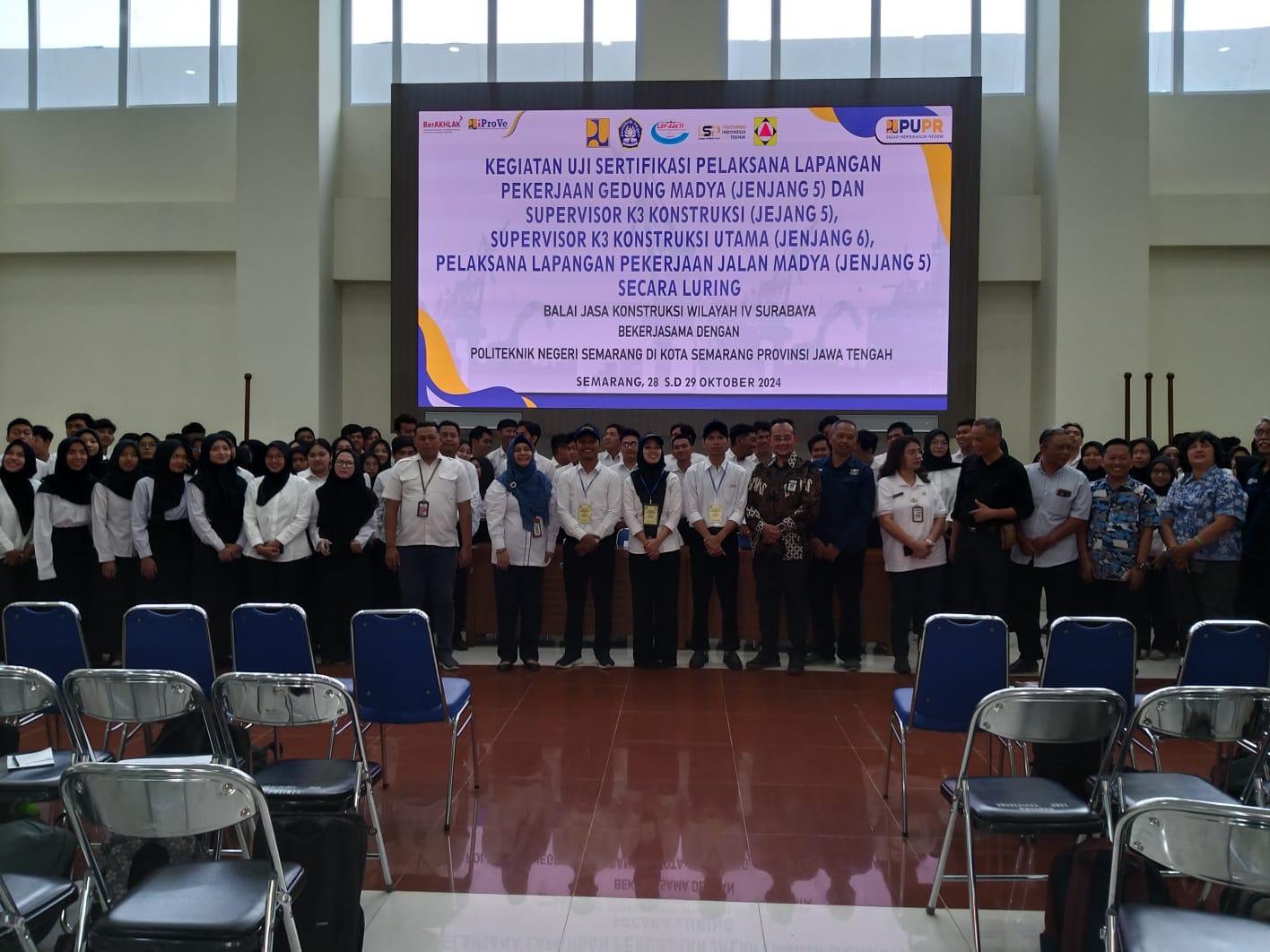Semarang – Pada Senin (28/10/2024) telah dilaksanakan Pembukaan Kegiatan Uji Sertifikasi Jenjang 5 dan Jenjang 6 di Politeknik Negeri Semarang. Kegiatan ini merupakan kerjasama antara Balai Jasa Konstruksi Wilayah IV Surabaya Kementerian PUPR dan Politeknik Negeri Semarang. Pada rangkaian kegiatan ini dilaksanakan uji sertifikasi secara luring untuk jabatan kerja Pelaksana Lapangan Pekerjaan Gedung Madya (Jenjang 5), Supervisor K3 Konstruksi (Jenjang 5), Supervisor K3 Konstruksi Utama (Jenjang 6), Pelaksana Lapangan Pekerjaan Jalan Madya (Jenjang 5) serta diikuti oleh 186 peserta alumni dan fresh graduate dari Politeknik Negeri Semarang.
